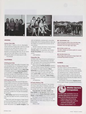On Campus: Arizona State (Beta Epsilon), Spring 2002. On Campus: CSU/Hayward (Eta Delta), Spring 2002. On Campus: CSU/Long Beach (Gamma Kappa), Spring 2002. On Campus: Pepperdine (Iota Alpha), Spring 2002. On Campus: UC/Santa Barbara (Gamma Beta), Spring 2002. On Campus: Eastern Illinois (Zeta Alpha), Spring 2002